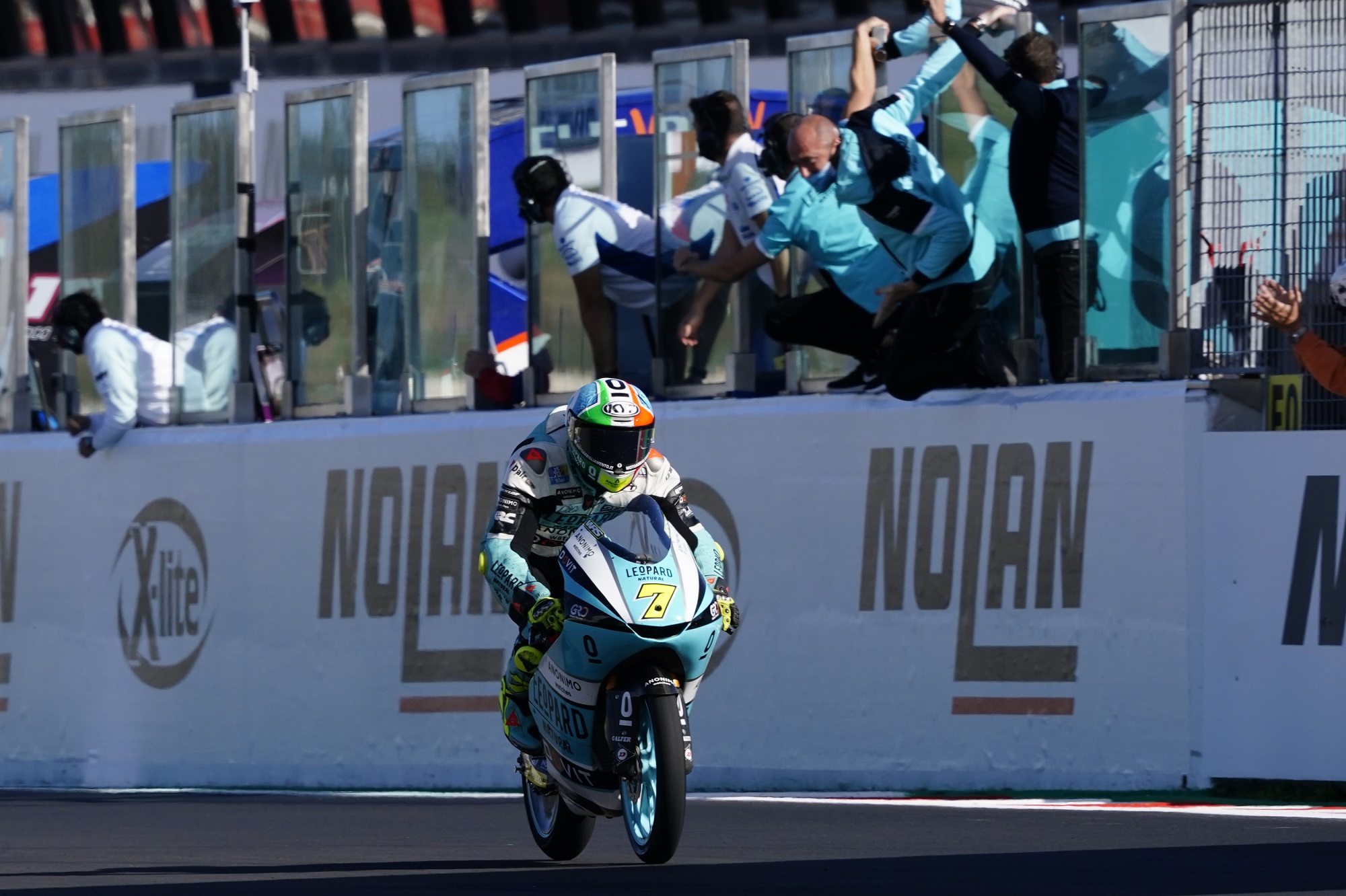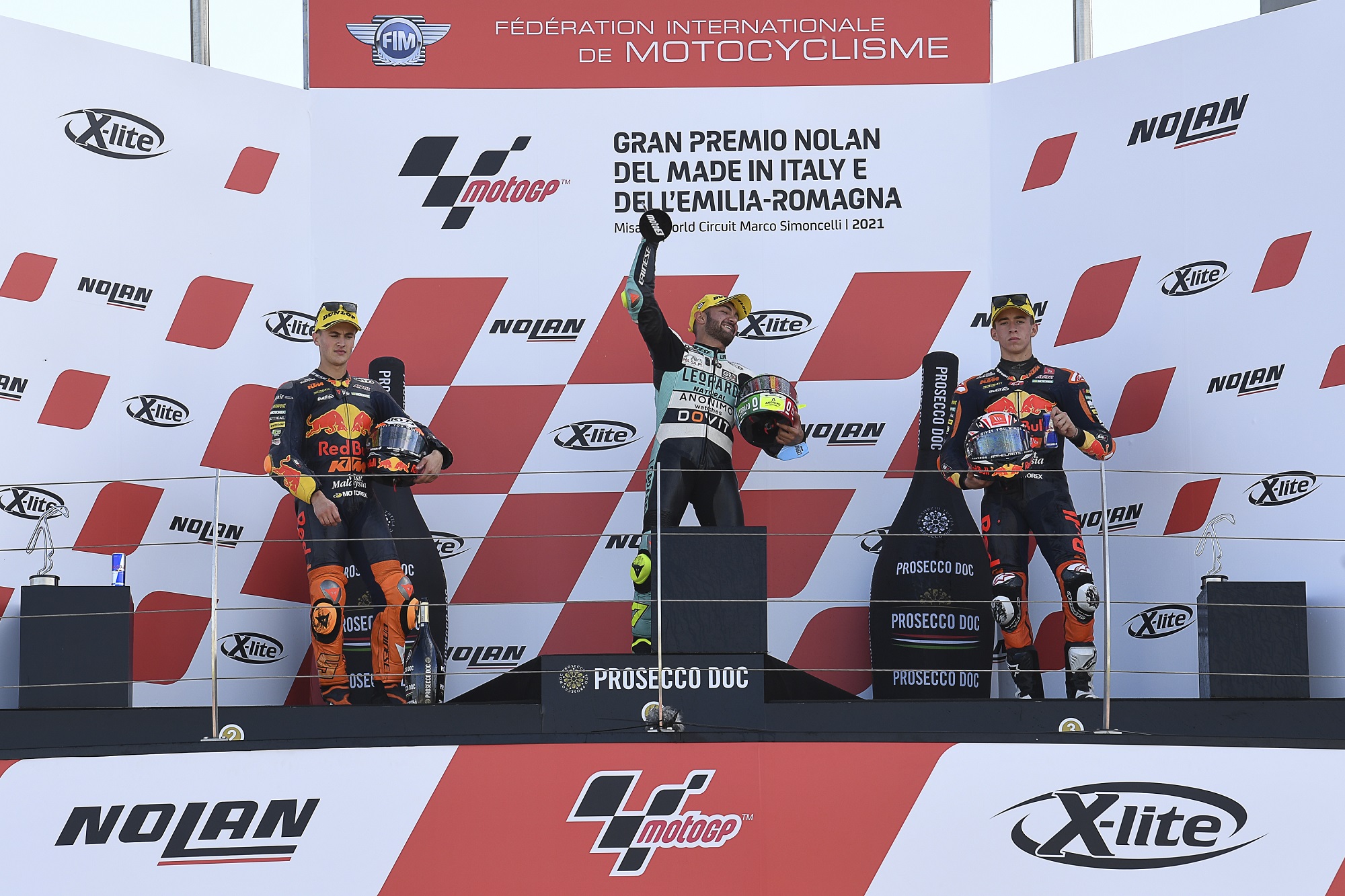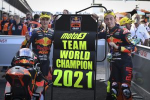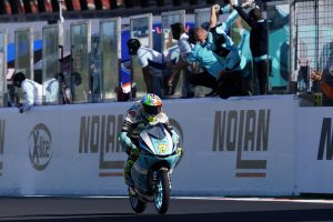 The heat was on for Dennis Foggia (Leopard Racing) in the Gran Premio Nolan del Made in Italy e dell’Emilia Romagna, with the Italian starting 14th on the grid as he aimed to stop key rival Pedro Acosta (Red Bull KTM Ajo) taking the title from fifth. But the Italian seared through after a tougher start to home in on the front group and then take the lead, thereafter pitching it to perfection to hold off an impressive race from Jaume Masia (Red Bull KTM Ajo). The fight for third went down to the wire, but Acosta did some damage limitation as he got back on the podium for the first time since the Styrian GP, keeping a healthy 21 points of advantage heading to the Algarve. In addition, the 2-3 wrapped up the Teams’ title for Red Bull KTM Ajo.