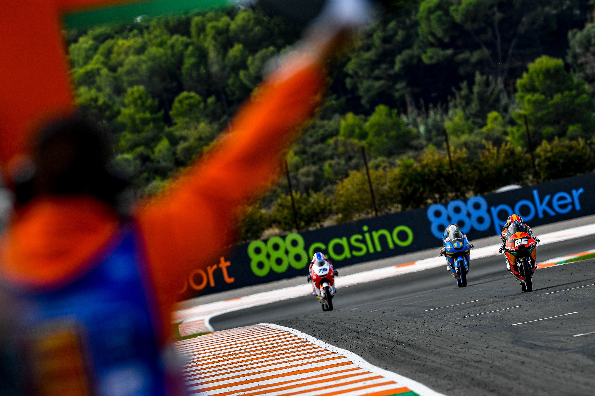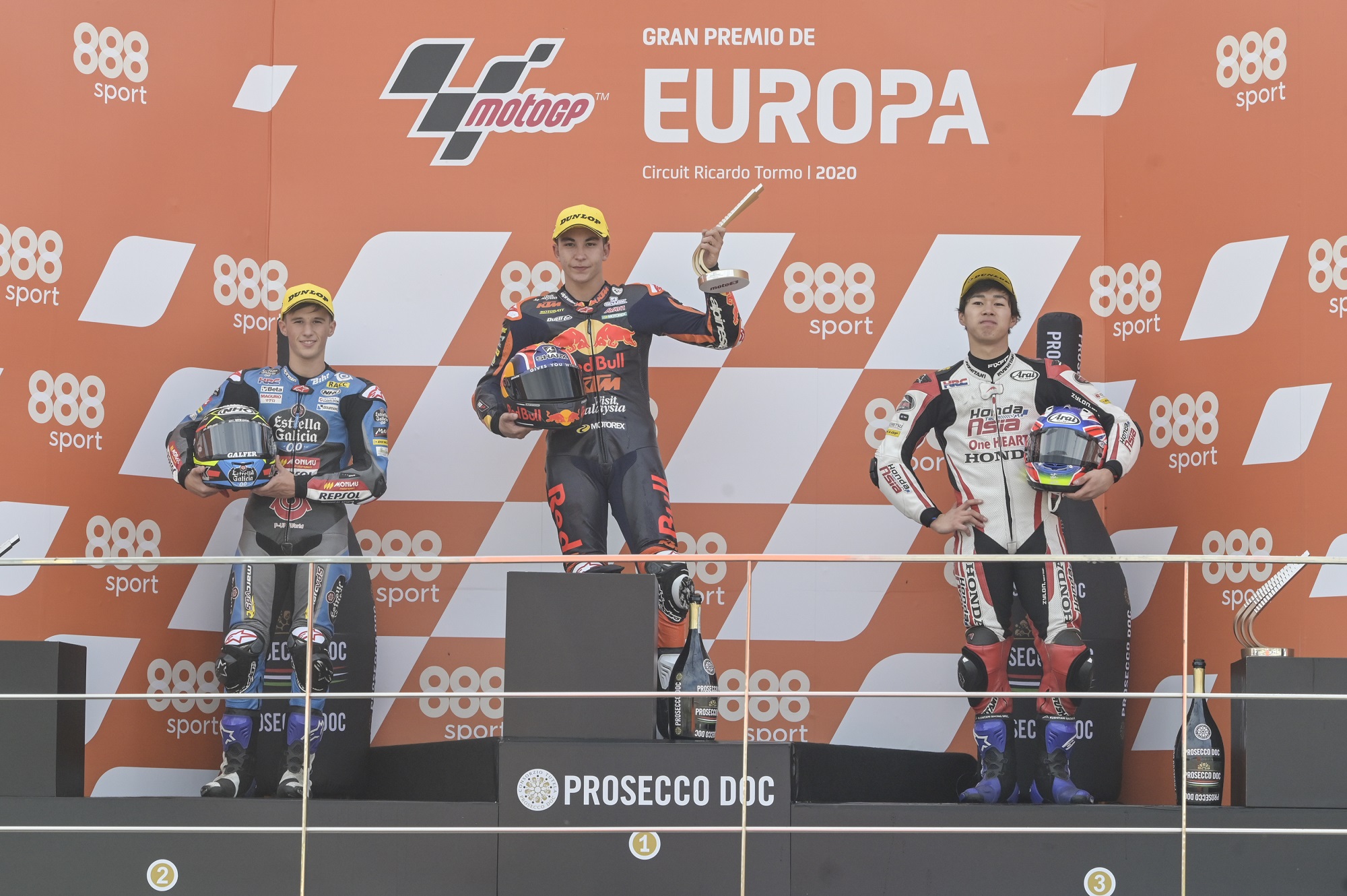 Raul Fernandez (Red Bull KTM Ajo) put in a stunner to take the lead early in the Gran Premio de Europa and then pull away, staying calm and collected to take to the top step for the first time in Grand Prix racing. Behind him a three-way battle royale raged on the final lap, with 2019 Valencia GP winner Sergio Garcia (Estrella Galicia 0,0) coming out on top to take second ahead of Ai Ogura (Honda Team Asia). The podium for Ogura boosts him up to within three points of the Championship lead as huge drama ripped through the standings for the majority of the other key contenders.
