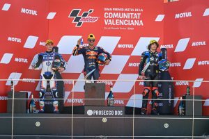 Tony Arbolino (Rivacold Snipers Team) took a stunning first win of the season in the Gran Premio Motul de la Comunitat Valenciana, clawing back a deficit to Raul Fernandez (Red Bull KTM Ajo) to take 25 valuable points that see him head into the season finale just 11 off the top and bringing the grand total of different 2020 winners across all classes to 25 – equalling the record set in 2016. Sergio Garcia (Estrella Galicia 0,0) won the duel for second against Fernandez, with the Red Bull KTM Ajo rider forced to settle for third. Championship leader Albert Arenas (Gaviota Aspar Team) took fourth and extended his lead to eight points ahead of eighth-place finisher Ai Ogura (Honda Team Asia) as the lightweigh class title continues to walk a tightrope.