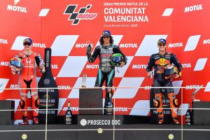 Franco Morbidelli (Petronas Yamaha SRT) and Jack Miller (Pramac Racing) put on a spectacular duel in the Gran Premio Motul de la Comunitat Valenciana as a tense race-long chess match turned into a final lap scrap for glory. It was decided by less than a tenth but it’s Morbidelli who comes out on top, gloves off to take his third win of the year and move up to second in the standings. Miller was forced to settle for second in the end, with Pol Espargaro (Red Bull KTM Factory Racing) once again completing the podium. Slightly further back, Joan Mir (Team Suzuki Ecstar) made dreams a reality as he took seventh place and secured the 2020 MotoGP™ World Championship, with key rivals not able to do enough to stop the Majorcan’s history-making charge.