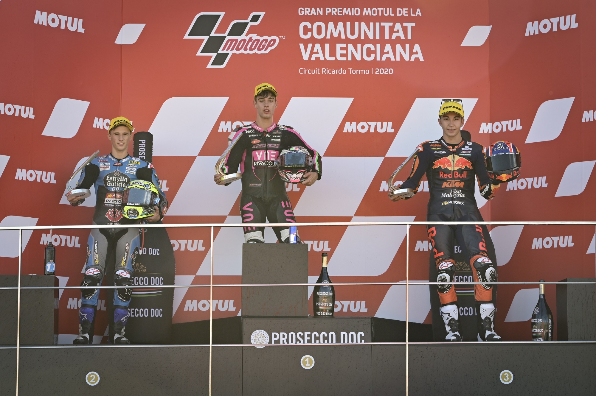 Tony Arbolino (Rivacold Snipers Team) took a stunning first win of the season in the Gran Premio Motul de la Comunitat Valenciana, clawing back a deficit to Raul Fernandez (Red Bull KTM Ajo) to take 25 valuable points that see him head into the season finale just 11 off the top and bringing the grand total of different 2020 winners across all classes to 25 – equalling the record set in 2016. Sergio Garcia (Estrella Galicia 0,0) won the duel for second against Fernandez, with the Red Bull KTM Ajo rider forced to settle for third. Championship leader Albert Arenas (Gaviota Aspar Team) took fourth and extended his lead to eight points ahead of eighth-place finisher Ai Ogura (Honda Team Asia) as the lightweigh class title continues to walk a tightrope.