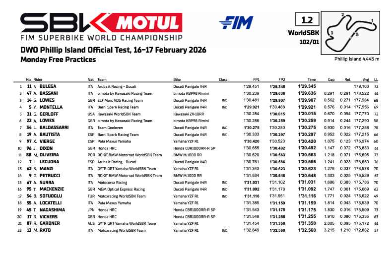 The 2026 MOTUL FIM Superbike World Championship Official Test opened in commanding fashion at Phillip Island Grand Prix Circuit, with Nicolo Bulega leading the way in both FP1 and FP2. The Italian set a 1’29.451 in the morning session before lowering the benchmark to a 1’29.345 in the afternoon, underlining his continued strength at the Australian venue. Bulega remains the current lap record holder at Phillip Island, courtesy of his 1’27.916 set during his remarkable 2024 debut weekend.