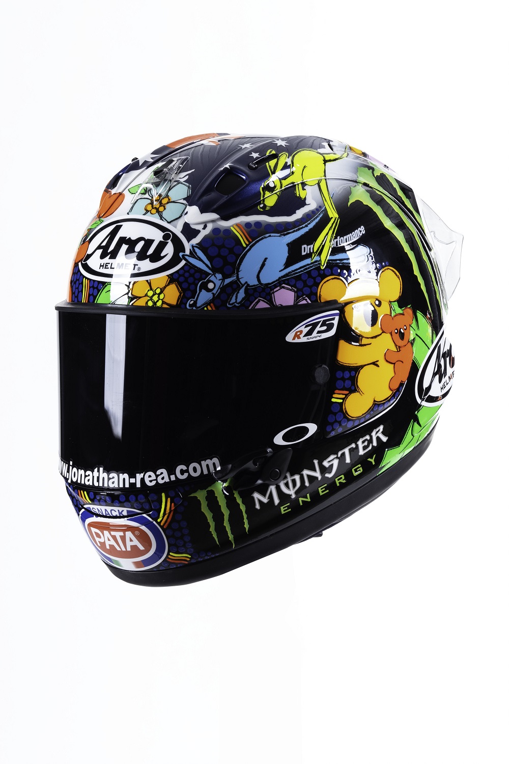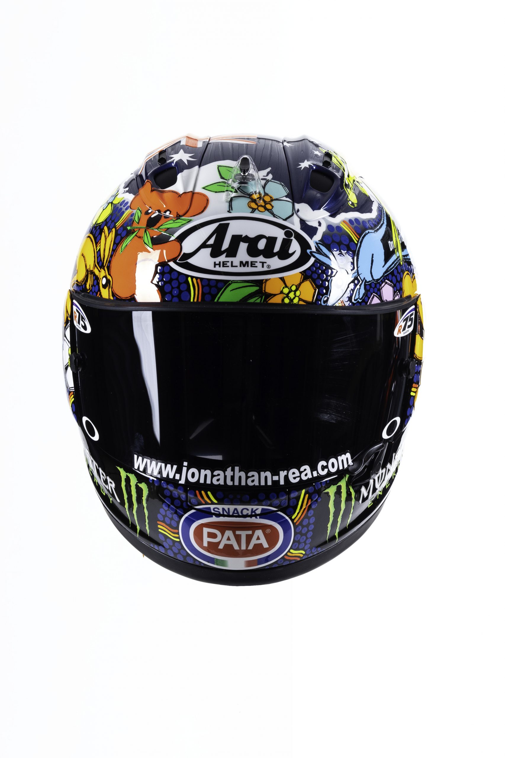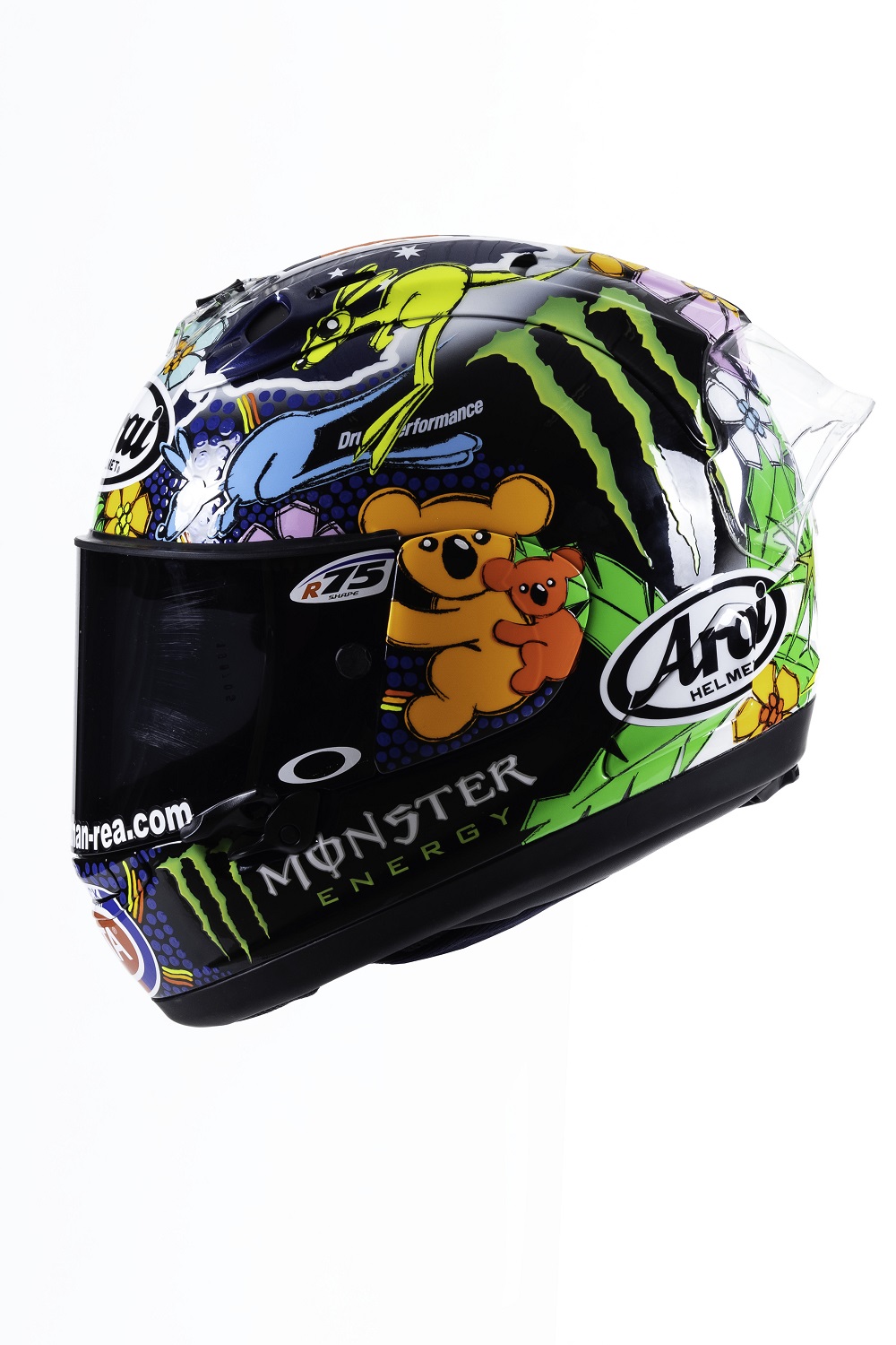 “During the bad situation in Australia I received a call from my friend Jonathan Rea asking me to do something special, to give some positive energy to Australia to beat the big problem with the bush fires.  We started thinking, me and the guys of my staff and watching television, the strongest image was the animals, especially the kangaroo and the koala, so we decide to create one helmet with those animals, but in a funny way, in a positive way, not in the bad situation that we were watching on television. So Johnny gave me some suggestions about that and we decided to present something that can give this kind of positive energy because Jonathan is also a guy that, when you meet him, you can feel the positive approach that he has for the sport and for life.  So we decided not to make a sad helmet for a sad situation but a fun helmet.  Finally we put the shape of the Australian nation on the top with the colours of the flag and we put all around it koalas and kangaroos and at the end, one touch was that we tried to make it in the style of the indigenous Aboriginal people with the small points in blue which is typical on the Aboriginal paintings. For sure it is a helmet that has a good meaning.  It is our best job, for our best friend and for Australia.”